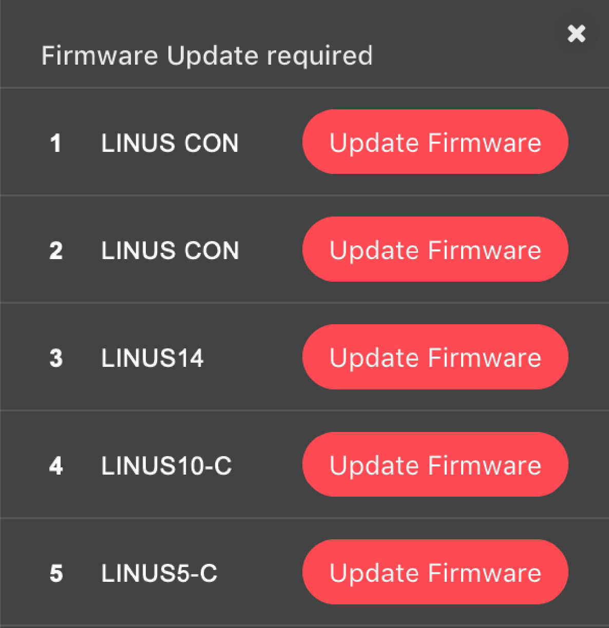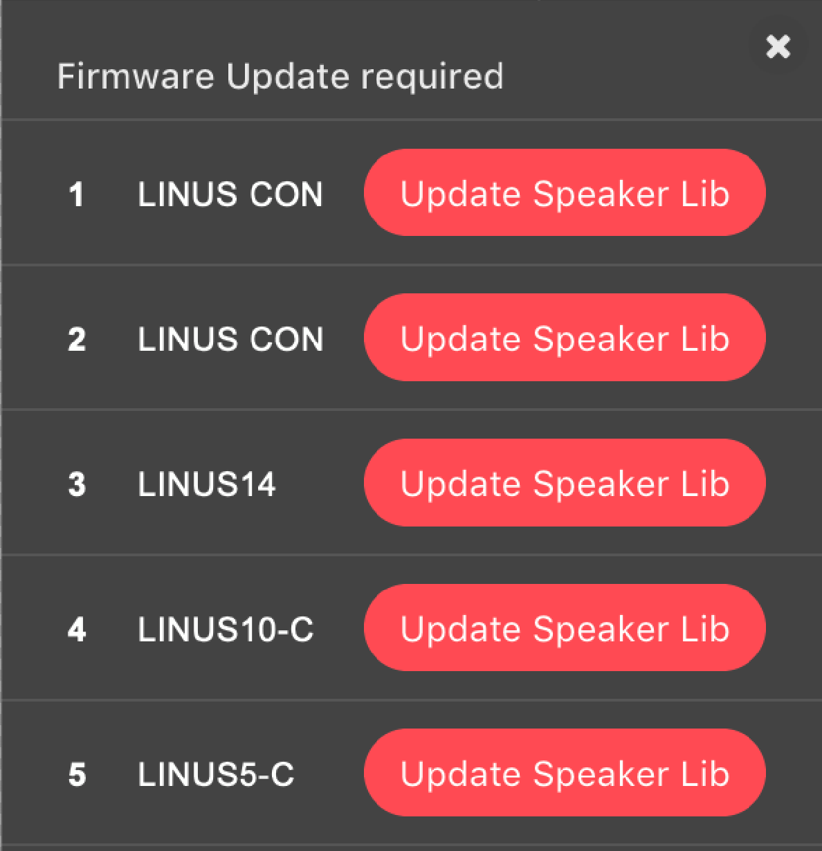 If you select over 6 Modules, which is 12x LINUS10 Amplifiers, the Firmware update process will fail, and you will have to update the devices one at a time, using the Hardware Update Mode.